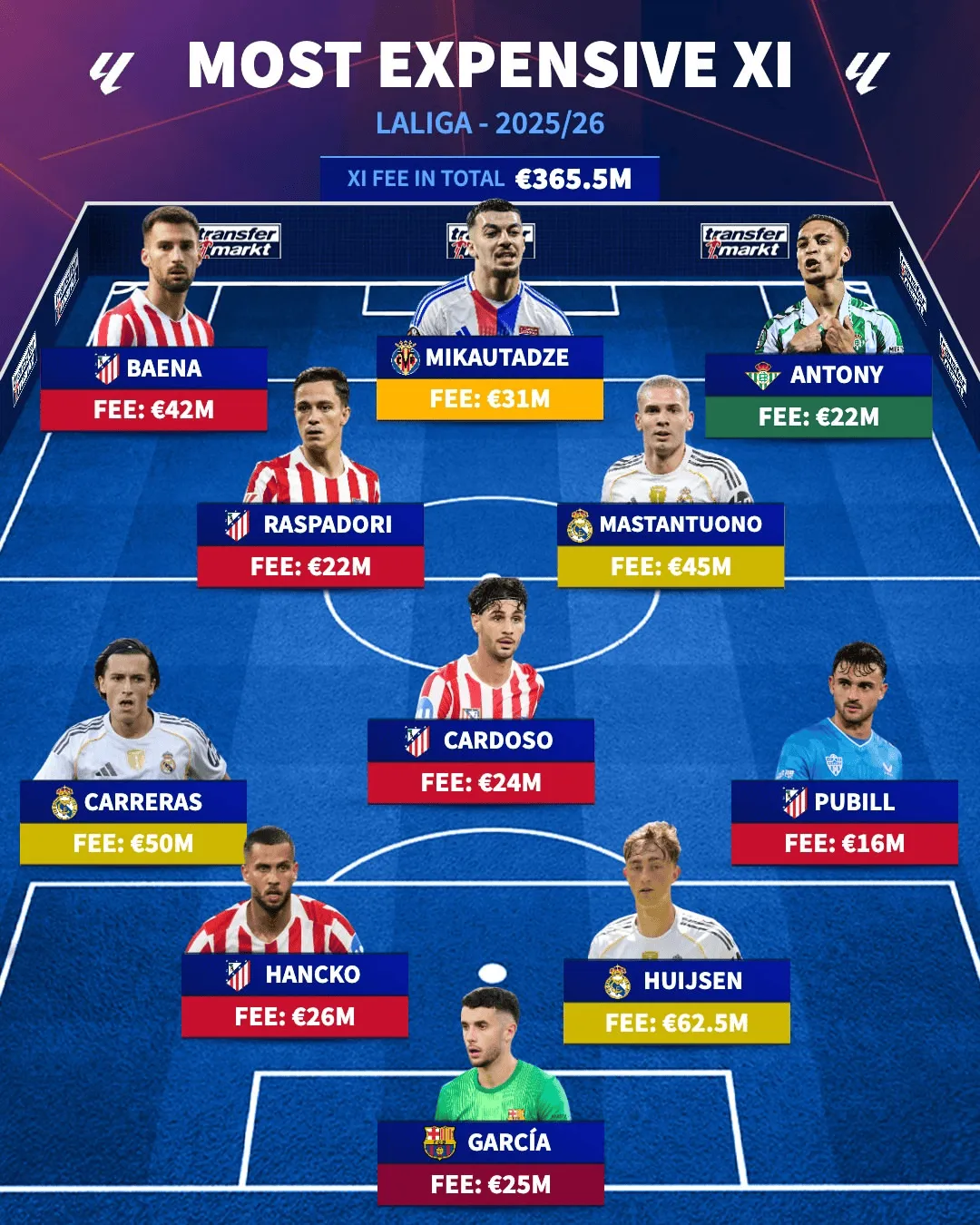 虎扑09月04日讯 德转网站盘点了西甲今夏最贵引援阵容,皇马赫伊森领衔,安东尼、卡雷拉斯、马斯坦托诺等在列。