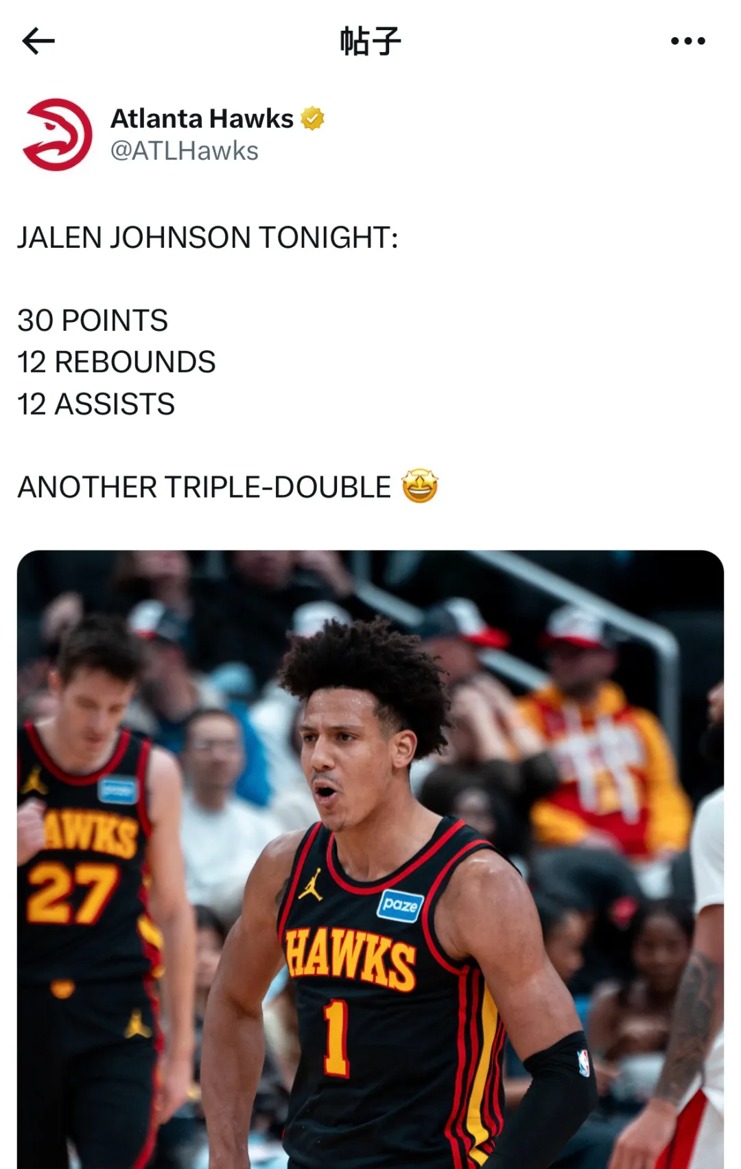 当亚特兰大老鹰官方社交媒体发出那条“过去24小时,杰伦·约翰逊:51分30篮板28助攻。天呐!”的动态时,整个NBA都意识到,一颗超越所有人预期的巨星正以火箭般的速度升空。